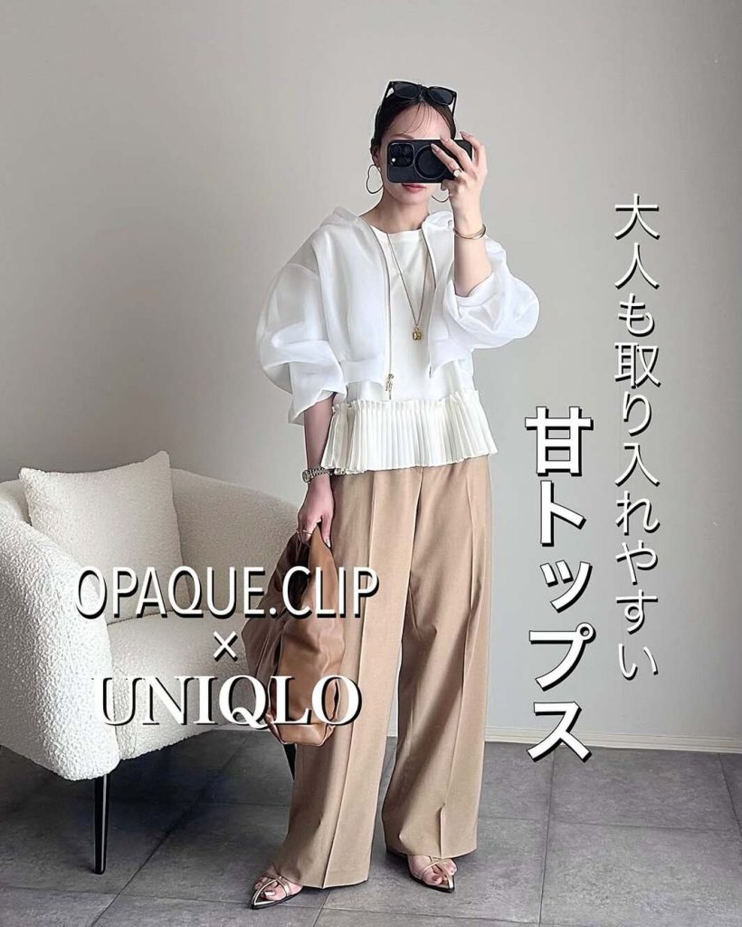 プリーツが可愛い甘トップスとスラックスを「シアーパーカー」で、ほどよくラフに。透ける生地だから重く見えません。メタリックサンダルで変化をつけるほか、パンツ&バッグをベージュに統一することでセンスUP。