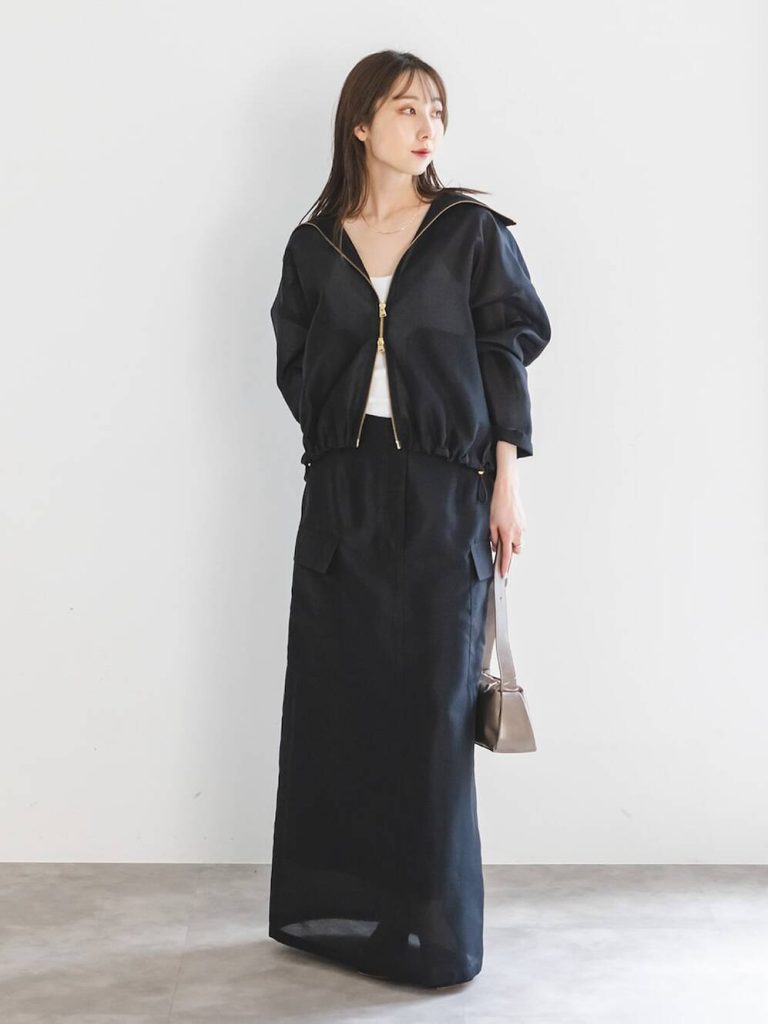 ふわりとした透け感が上品なブラックコーデ。シアーブルゾンは、ダブルジップの調整と透け感で抜けを演出でき、白インナーを仕込めば、黒でも顔まわりがパッと明るく映えます。軽やかなロングスカートはカーゴ調ポケットで甘さを引き算。質感とデザインがもたらすバランスのおかげで、上下ブラックでも、特有の重厚感を払拭できます。