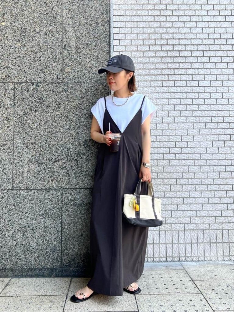 ドライなナイロン素材のキャミワンピに、肩まわりをすっきり見せるショルダーTを重ねた、夏にぴったりの快適モノトーンコーデ。大人顔なキャップやゴールドが効いたトングサンダルでカジュアル感と抜け感をプラスすれば、楽ちんながら夏映えするレイヤードが完成します。何かと活躍するミニトートは、キーホルダーをつけてちょっとした遊び心を注入して。