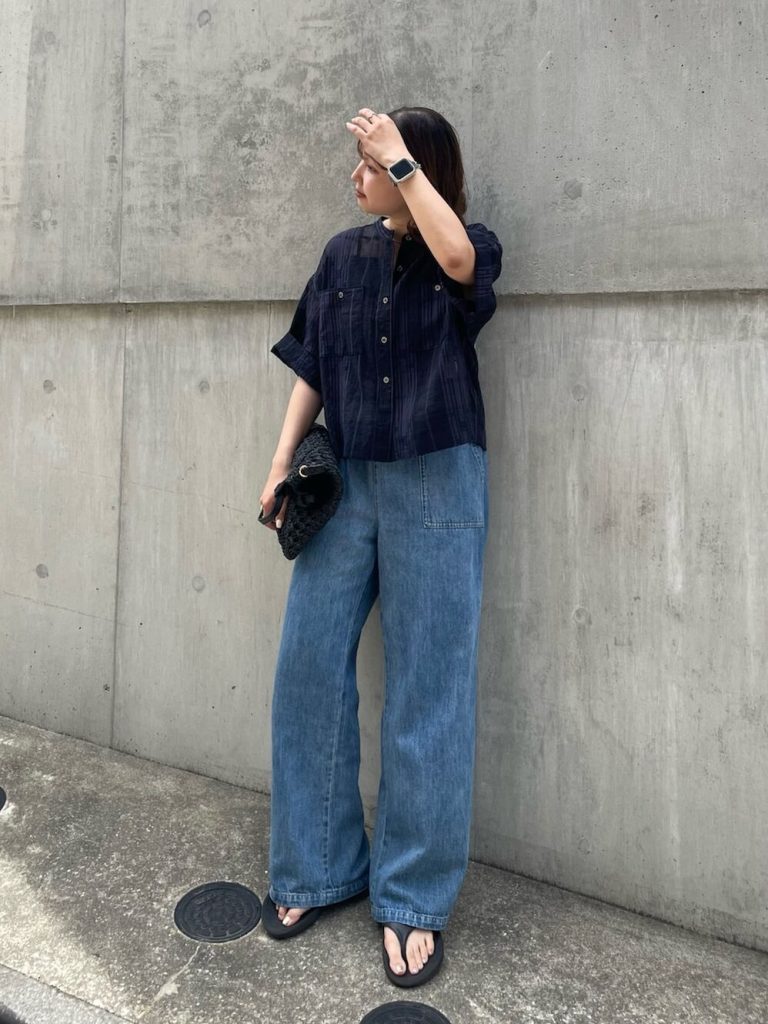 淡色グリーンのシアーシャツでほんのり肌見せしつつ、やわらかワイドデニムで視線を縦に流した大人ヘルシースタイル。リラックス感とシャープさを兼ね備えたバランスが、暑い日も清涼感のある印象に導きます。風が通るゆったりシルエットで、見た目も着心地もサマームードたっぷり。