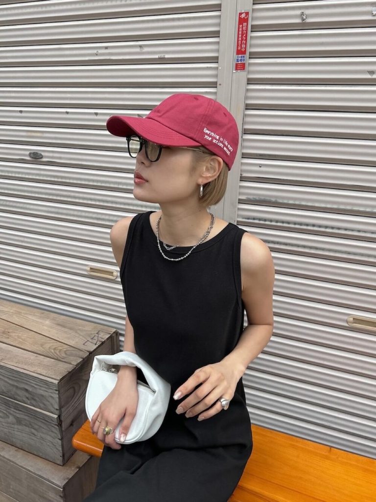 一枚でサマになる黒のロングワンピースに、赤キャップでポップなアクセントを効かせたメリハリコーデ。ワントーンになりがちな黒スタイルも、キャップの色を効かせるだけで一気に洒落感がアップ。リラックス感のあるスニーカー合わせでラフに着崩しつつ、白クラッチやチェーンネックレスで大人の品も忘れずに。色×抜け感でつくる、夏の上級モノトーンです。