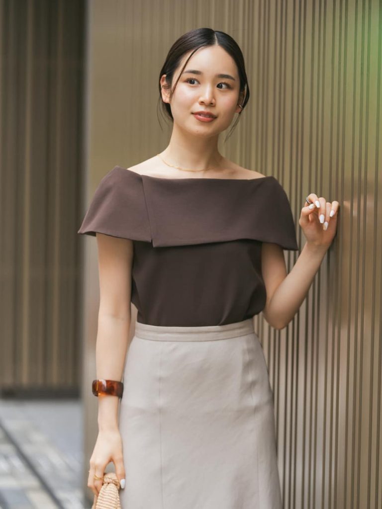 深みのあるダークブラウンのノースリーブに、黒のワイドパンツを合わせた洗練配色。どちらもベーシックながら、色のトーンをしっかり落とすことで、夏でも重たく見えず、モード感のある印象に仕上がります。ブラウンを大人っぽく着こなすコツは、素材に艶を含ませることと、シルエットでゆとりをもたせること。全身を2色でまとめる潔さが、かえって着映えに繋がります。