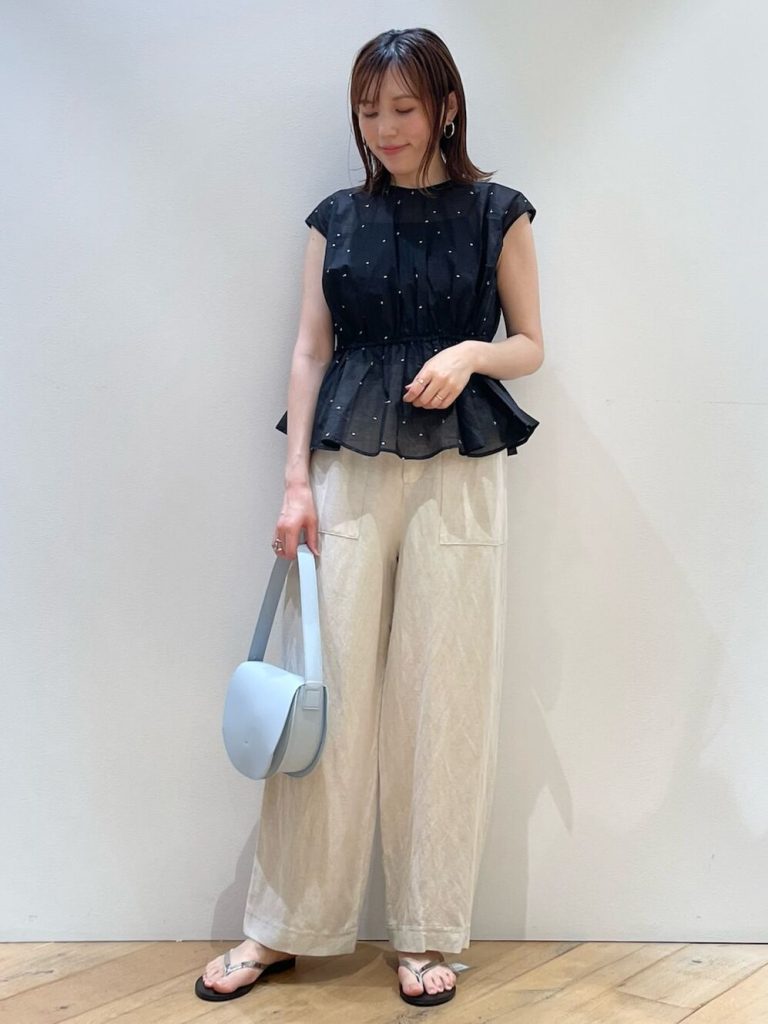 ブラックのトップスは、ワイドスウェットパンツに裾INしてこなれコーデに。ドット柄ブラウスはほかのトップスと重ね着するのもありです。