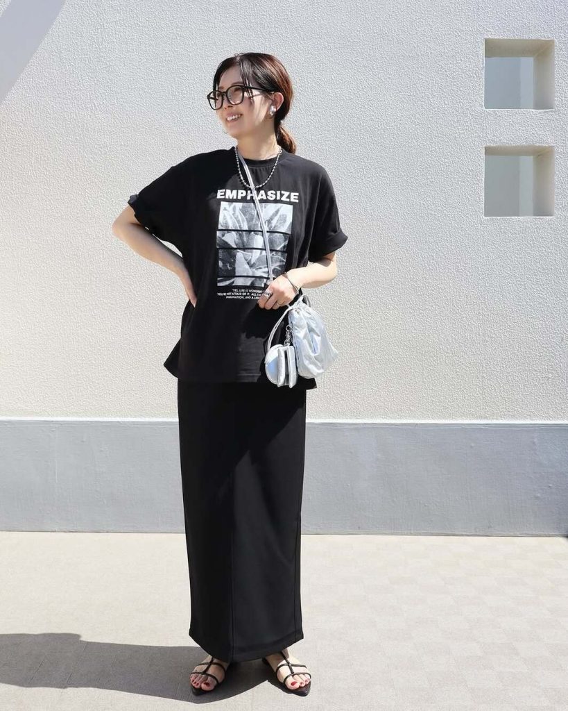 白やビビットカラーなど夏は明るい色ばかりに手が伸びがちですが、たまにはシックに黒でまとめるのも素敵ですよ。ナロースカートにお気に入りの黒Tを合わせて、大人の週末コーデを。華奢なサンダルとシルバー小物により、手抜き感ゼロのイマドキスタイルに仕上がります。