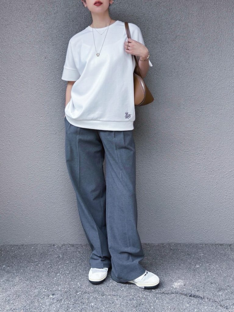 シンプルなトップスとパンツのワンツーコーデも、足元にスニーカーを選ぶだけでイマドキなコーディネートが完成します。地味見えしないためには、トップスの素材感がポイント。スムースな肌触りやロゴ刺繍などできれいめムードが漂えば、それだけで大人のスニーカーコーデが一段とセンスアップします。
