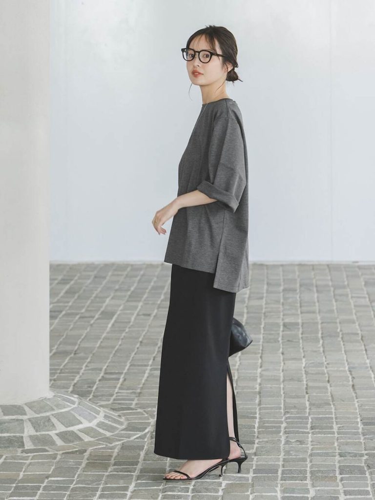 チャコールグレーのゆったりトップスに、すとんと落ちる黒スカートを合わせたリラクシーな装い。落ち着いたトーンながら、ロールアップ袖や細身のストラップサンダルで抜け感と女性らしさを演出。小ぶりのバッグやシルバーネックレスなど、ミニマルな小物使いも都会的な印象を後押しします。締めすぎず、でもラフすぎないバランスが、週末のショッピングやカフェランチにぴったりな大人のカジュアルスタイルです。
