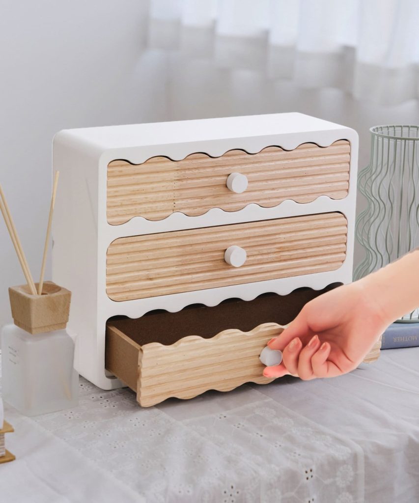 天然木のぬくもりと、曲線デザインが魅力のドロワーボックス。個性的ですが、ウッディ×ホワイトカラーなので部屋になじみます。引き出しには、文房具やコスメ、アクセサリーなど小物を収納できますよ。