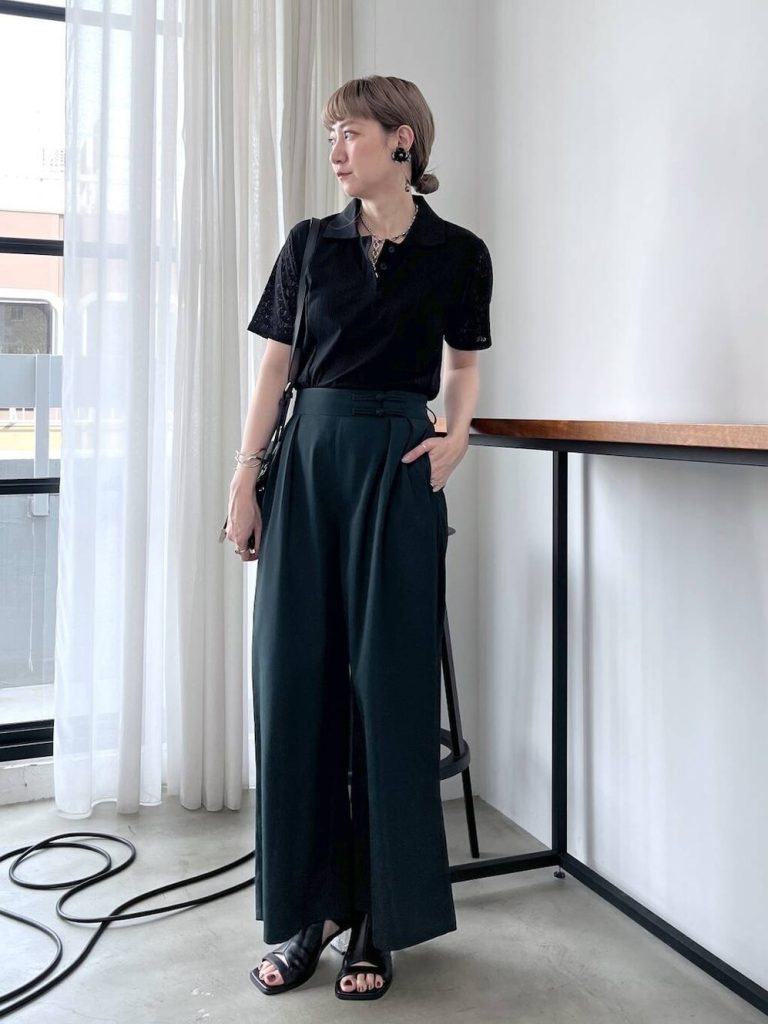 ダークグリーンのワイドパンツに、バッグやシューズまでブラックというとことんダークトーン。夏らしいモードスタイルに仕上がっています。