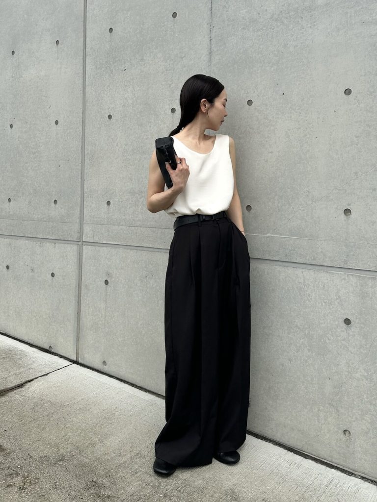 ②モードに魅せる。白タンク×黒スラックスの辛口モノトーン