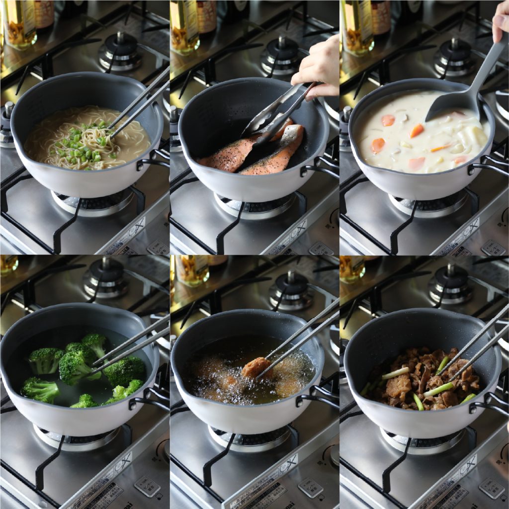 揚げ物をはじめ、炒める・茹でる・焼く・煮る・湯を沸かす、6パターンの調理が可能です。深さのある形状と注ぎ口付きで、スープや煮込み料理にも最適。万能すぎてキッチンのマストアイテムになること間違いなしのフライパンです。