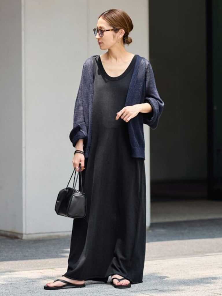 ほんのり透けるカーディガンは、朝晩の寒暖差が出てくる時期に頼れる存在。軽やかなネイビーが目に映るたび、清涼感を呼び込みながら肌をやさしく覆います。ボタンを留めれば、深めのVネックで首元をすっきり見せられます。インナー次第で表情を変えられるのも魅力です。リラクシーなワンピと合わせて、洗練された大人のヘルシースタイルに。