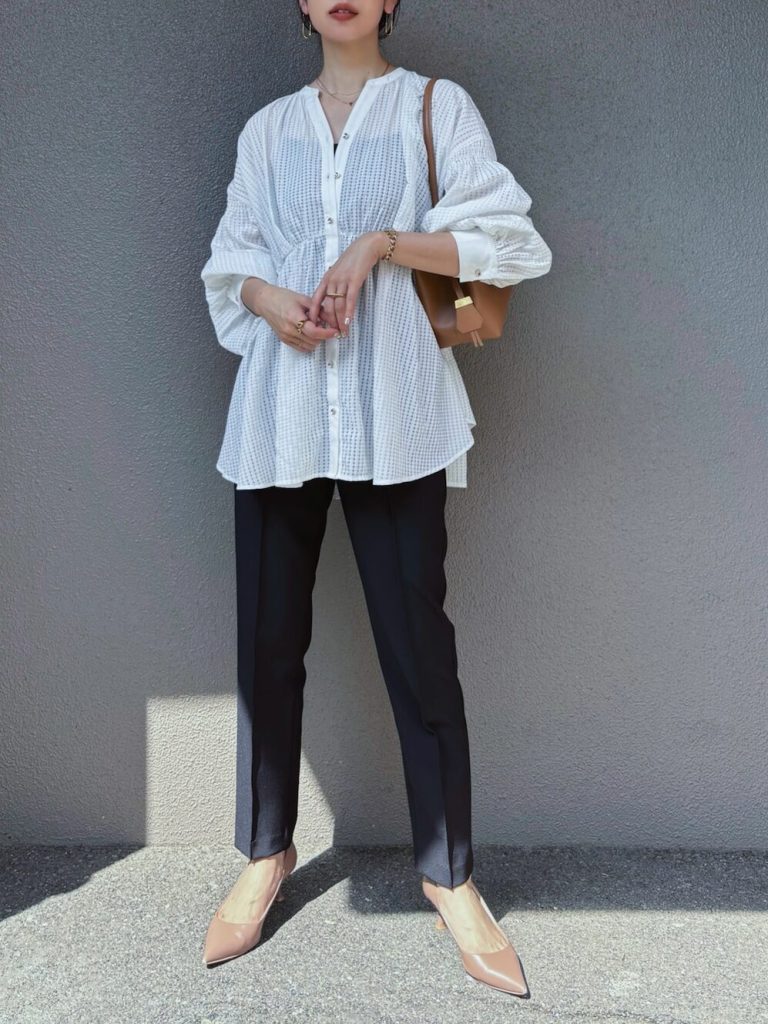 朝から重要な会議が入っている日は、清潔感のある白ブラウスに頼るのが正解。シアーな風合いとふんわり袖が女性らしさを漂わせつつ、黒のテーパードパンツが全体を引き締めてきちんと感を演出します。ベージュのパンプスとバッグで柔らかさを添えれば、堅苦しくなりすぎず好印象に。オフィスでのプレゼンや社外の打ち合わせなど、人前に立つシーンでも背筋が自然と伸びるコーディネート。爽やかな白が一日のスタートを前向きにしてくれます。
