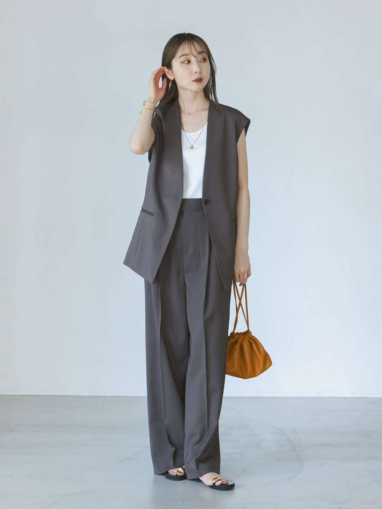 木曜日は週の疲れを見せず、クールに引き締めたい日。ノースリーブのジャケットとワイドパンツのセットアップなら、動きやすさとモード感を両立できます。インナーは白のカットソーで軽さを加え、堅さを和らげるのがポイント。ブラウンの巾着バッグでさりげなく季節感を添えれば、全体がぐっとこなれた印象に。オフィスでのプレゼンや外回りの日にも頼れる、洗練された大人の通勤スタイルです。足元はフラットサンダルで程よいリラックス感をプラス。