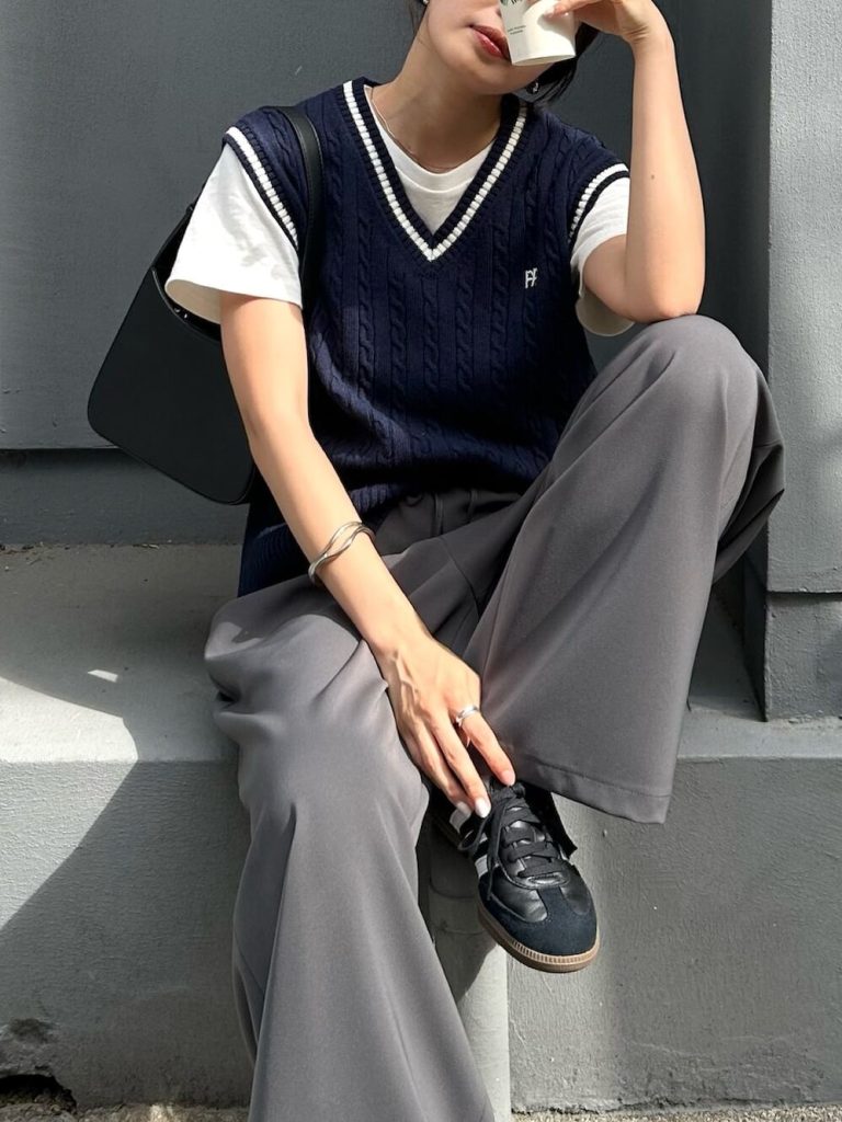 白Tにネイビーのニットベストを重ねれば、残暑の中でも秋らしさを簡単に取り入れられるプレッピースタイルに。半袖Tシャツの軽さはそのままに、ベストの編み地がほんのり季節感をプラスしてくれます。グレーパンツと黒スニーカーで全体を引き締めれば、大人っぽさとリラックス感が絶妙に両立。休日のカフェや公園でのリラックスタイムにぴったりで、9月後半の気温にちょうどいいレイヤードです。