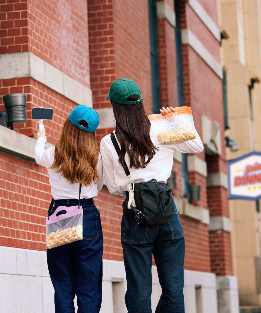 カラフルな持ち手が目を惹くのはポップコーン用のジップバッグ。グループや家族でポップコーンを気軽に分け合えます。テーマパークや遊園地はもちろん、映画館でも活躍!