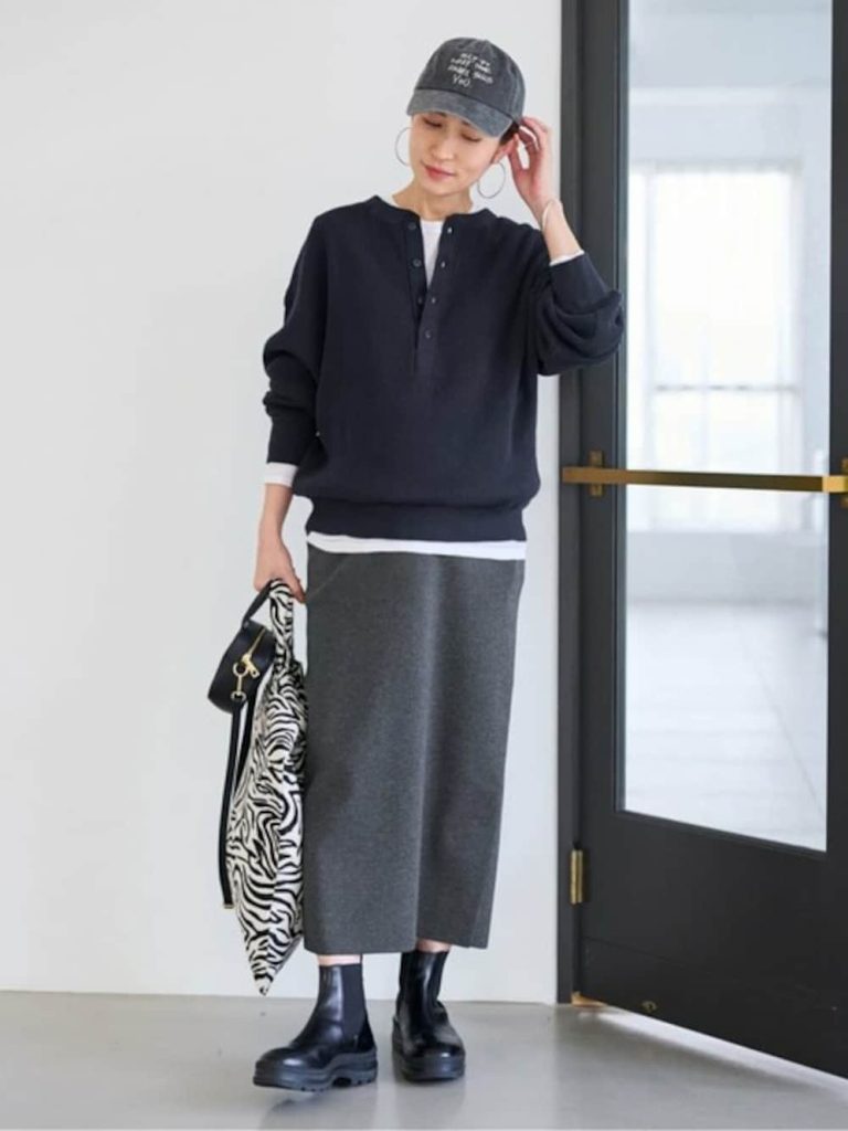 タイトスカートに厚底ブーツを合わせるだけで、洒落感が上がる秋コーデ。ウール混の素材がほんのり季節感を添えて、シンプルなのに地味見えしません。トップスはカジュアルでも、足元を重厚感のあるアイテムで締めるだけで見違えるほどクールな雰囲気に。