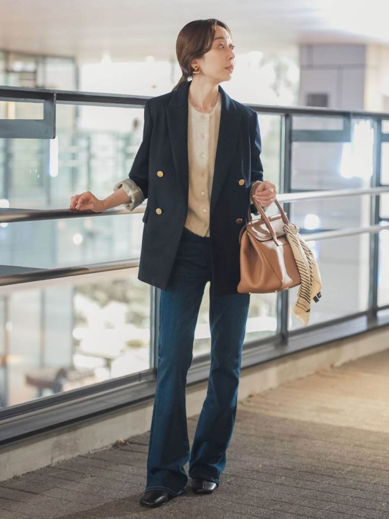 きちんと見せたい日には、ネイビージャケットが頼れる味方。ゴールドボタンが程よい華やかさを添え、ベージュニットでやわらかさもプラス。濃色のフレアデニムを合わせれば、硬くなりすぎずに知的さと抜け感を両立できます。会議や外回りの合間にカフェでひと息…そんな一日にもぴったり。ブラウンのバッグでトーンをつなぎ、秋らしいクラシックムードを完成させて。