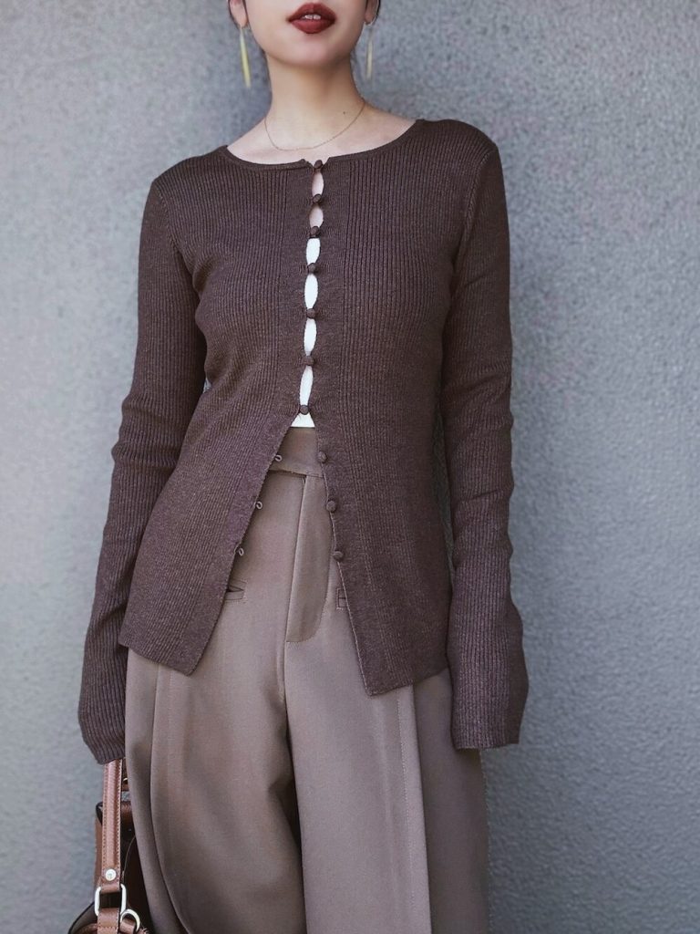 リブカーディガンとワイドパンツをブラウンで統一した、柔らかさと強さを兼ね備えたスタイル。前立てのボタンを少し外して、さりげない抜けをプラスするのが今の気分。上質なレザーバッグやレオパード柄のパンプスが、シンプルな中に艶と遊びを添えています。全身を同系色でまとめることで、縦のラインが引き立ち、すっきりとした印象に。落ち着きのあるカラーながら華やかさも感じさせる、大人のきれいめカジュアルです。