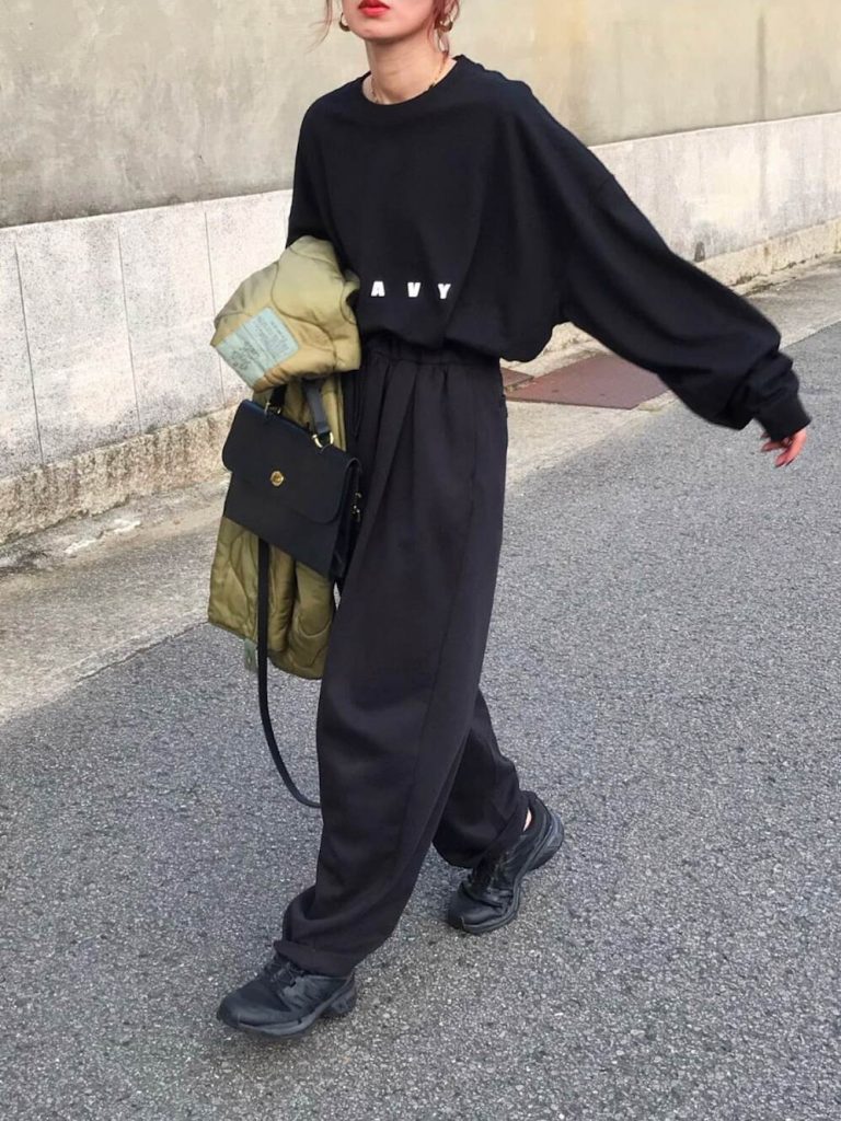 ロゴ入りのスウェットにワイドパンツを合わせた、ゆるさと端正さのバランスが絶妙なオールブラック。足元のボリュームスニーカーで重心を落としつつ、赤リップとゴールドアクセで女らしさをひとさじ。アウターは手に掛けて軽快に、ブラックの面積をリズミカルに見せています。頑張らずに洒落る、そのさじ加減が今の気分です。