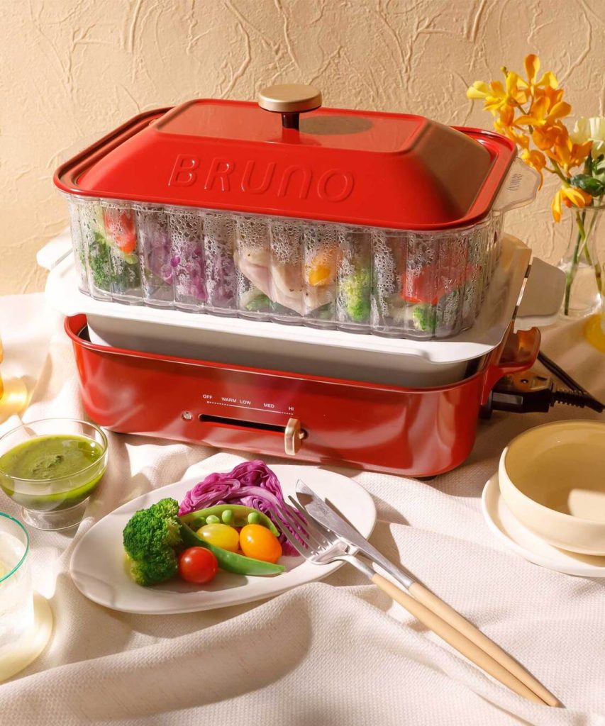 ホットプレートでおなじみのBRUNO(ブルーノ)から、せいろなしで蒸し料理ができるスチーマーが登場!ホットプレートにセットして、水を入れて沸騰させるだけで、簡単に蒸せます。