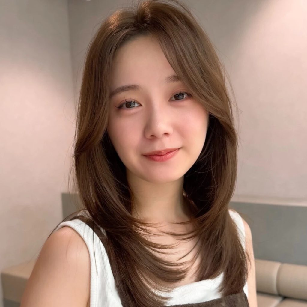 低めレイヤーのおかげで手ぐしでラフに乾かすだけでも毛先が自然と内側に入り、お手入れが簡単なミディアムスタイル。今っぽい抜け感と品の良さを両立したデザインは、大人の女性にぴったりです。長めの前髪は、おでこが狭い、丸顔などのお悩みカバーも叶います。