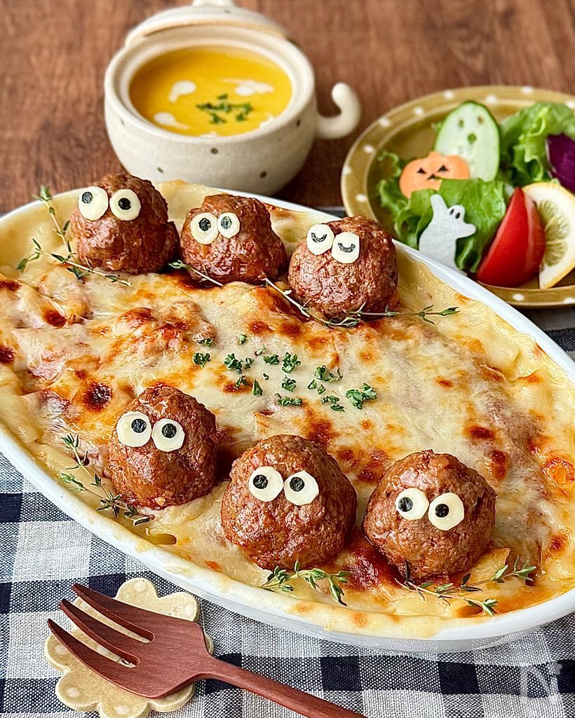 おばけの表情がかわいいミートボールをたくさんのせたグラタン。マカロニも入っていてボリューム満点です。トマトソースとホワイトソース、どちらも味わえる贅沢な一品。特別感があるので、ホームパーティーなどにもおすすめです。