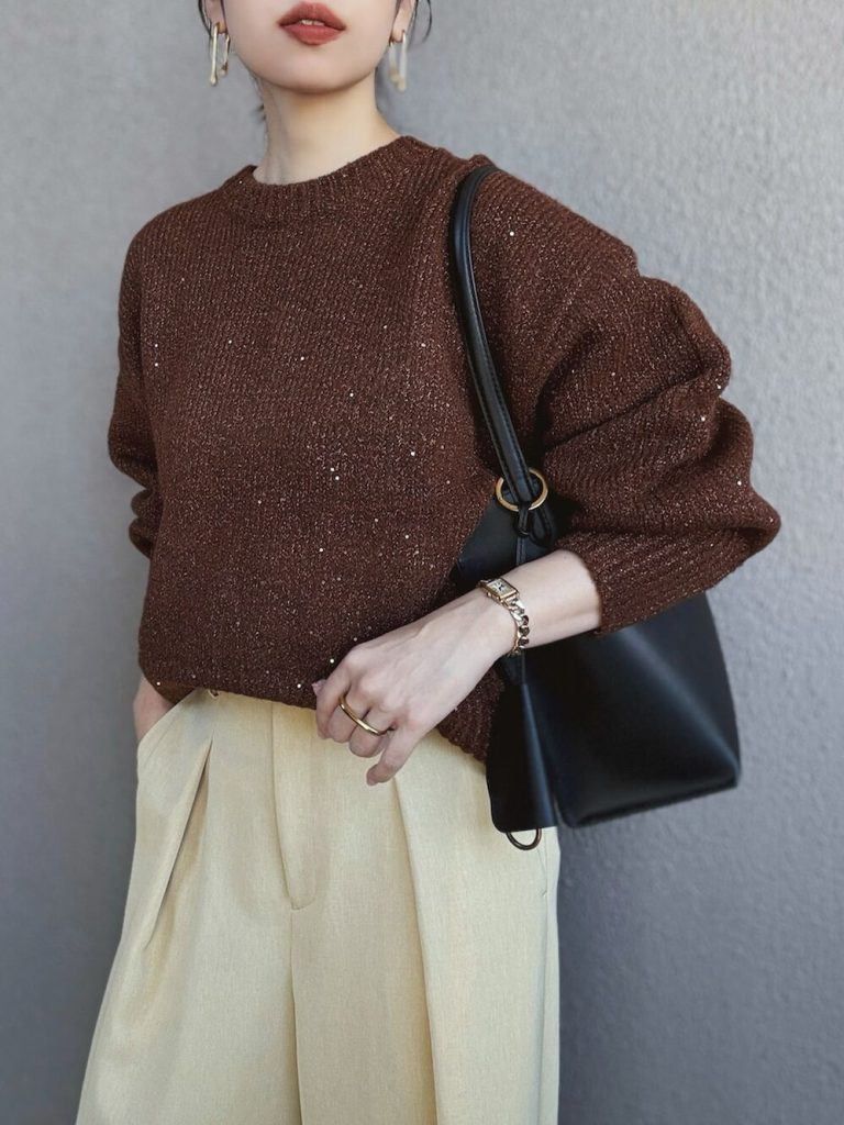 穏やかな気持ちで過ごしたい日には、ブラウンのニットで落ち着きを。ラメを織り込んだような控えめなツヤが、シンプルな中にも上品さを漂わせます。ボトムはゆったりとしたクリームベージュのワイドパンツを選び、抜け感のあるバランスに。黒のバッグとポインテッドトゥで全体を引き締めると、きれいめな印象にまとまります。打ち合わせや外出が少ない日でも、品を忘れないオフィスカジュアルです。