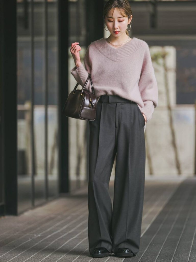 ほんのり甘いくすみピンクのニットに、チャコールグレーのワイドパンツを合わせた、上品さとカジュアルさのバランスが絶妙なコーディネート。ふんわりとした質感が女性らしさを引き立てつつ、Vネックで顔まわりをすっきり見せます。小物はダークブラウンでまとめてトーンを整えると、落ち着いた雰囲気に。柔らかさと知的さを両立した、感度高めなスタイル。
