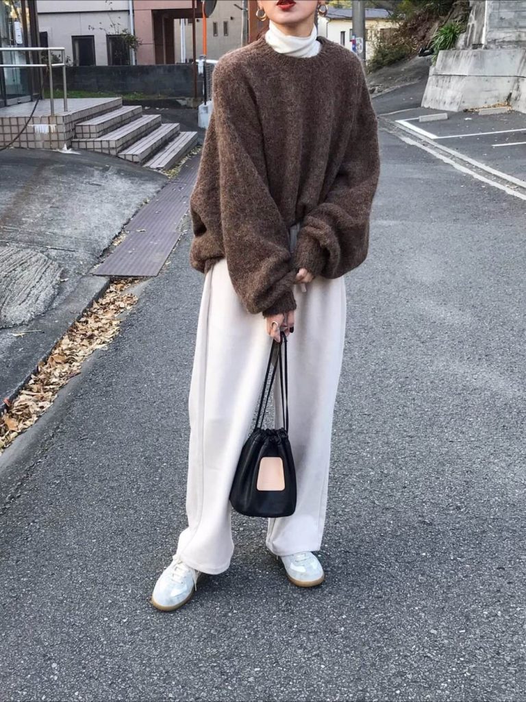 ふんわりとしたブラウンニットに白のハイネックをレイヤード。ゆったりシルエットのパンツを合わせて、こなれ感のある抜けをつくったリラクシースタイルです。首元に白を挟むことで顔まわりが明るくなり、同時に防寒性もアップ。ニットの毛足と淡いボトムの柔らかなコントラストが、シーズンムードをより引き立てます。仕上げに黒の巾着バッグで全体を引き締め、バランスの取れた大人カジュアルに。