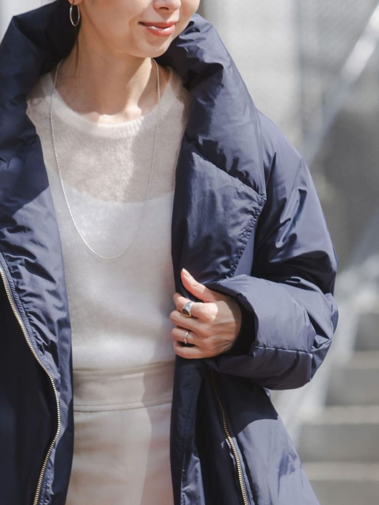 ネイビーのボリュームアウターを主役にしつつ、全体を白で統一することで冬の装いに透明感をプラス。アウターのフォルムが程よい抜け感をもたらし、ワイドパンツの縦ラインが全身を整えてくれます。インナーのレイヤードが明るさを引き寄せ、寒い日の通勤にも無理なく馴染む着こなしに。足元はフラットシューズで軽快さをキープ。暖かさと上品さのちょうどいい間を叶える、冬の頼れるカジュアルアウタースタイルです。
