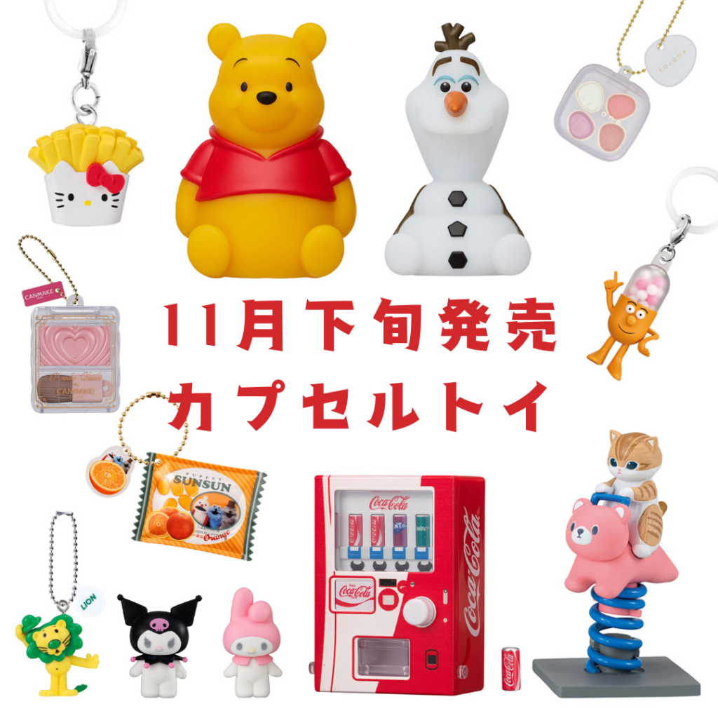 11月下旬の新作カプセルトイを一挙にご紹介。今回は冬らしいアイテムや、人気のキャラクター、化粧品や日用品のミニチュアなど、様々なアイテムが揃っていますよ。この記事で発売日と設置場所をチェックしてくださいね。