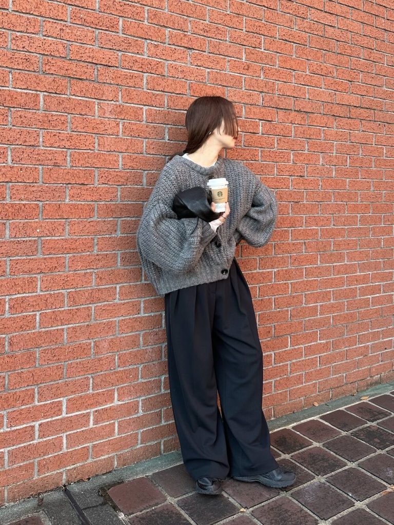 ざっくり編みのグレーのカーディガンに、黒のワイドパンツを合わせたリラックス感漂うコーディネート。ボリュームスリーブの柔らかさと、落ち感のあるパンツのバランスが絶妙で、気張らずにこなれた印象をつくれます。足元は黒でまとめて統一感を出しつつ、軽いアウターを手に持つことで、朝晩の気温差にもスマートに対応。コーヒー片手のワンシーンも、大人の余裕を感じさせるカジュアルスタイルに。