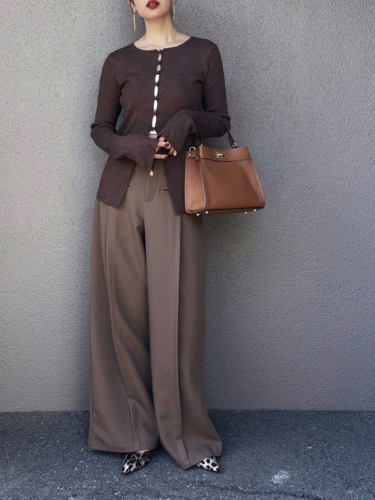 派手さが欲しいのではなく、今っぽさが欲しい。そんな日に活躍してくれるのが、ブラウンのパンツです。トレンドカラーというだけではなく、「黒でもグレーでもない」というわずかな”ずらし”が、コーデに抜け感を加えてくれます。去年ヘビロテしたニットも、ボトムスをブラウンに変えるだけでグッと垢ぬけます。