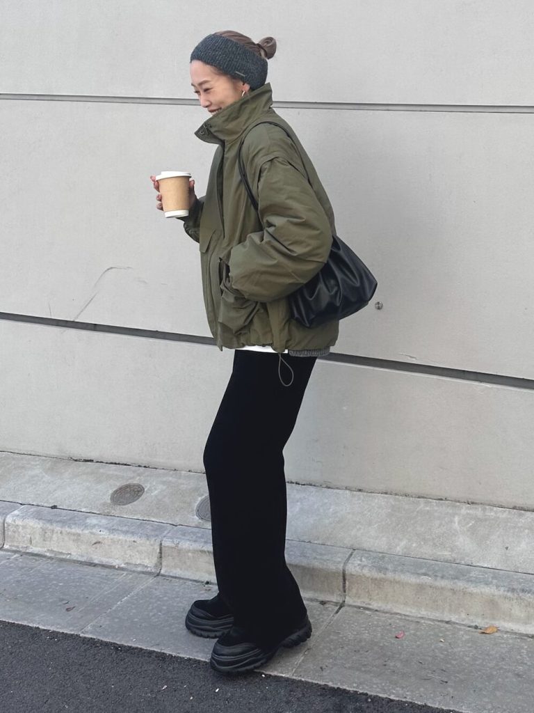 カーキのアウターに黒のワイドパンツを合わせた、力の抜けたカジュアルコーデ。スポーティなヘアバンドやボリュームスニーカーでアクティブさを添えつつ、黒パンツの端正さが装いを落ち着かせてくれます。アウターの立ち上がる襟が顔まわりをシャープに見せ、ラフなのにどこか洗練された雰囲気に。オフの日のコーヒータイムにもぴったりな、こなれ感のある冬コーデです。