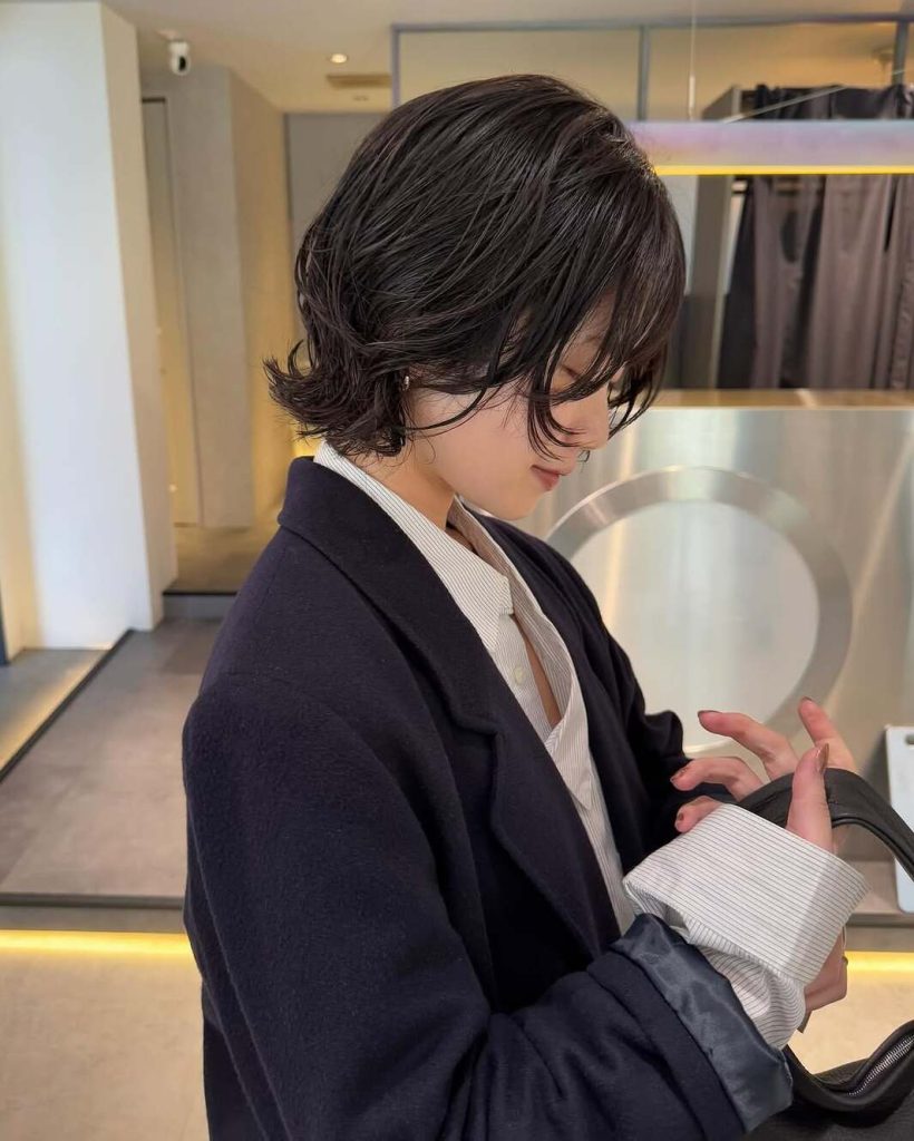 残ったパーマの動きを活かし、空気を含んだような質感に仕上げた顎ラインボブ。揺れる毛束が表情を明るく見せ、短めレングスでもやさしい雰囲気を保てます。スタイリング剤を少量なじませるだけで立体感が生まれるため、頑張りすぎず上品にまとまるのも魅力。シンプルな装いにも自然とマッチするニュアンスたっぷりなボブです。