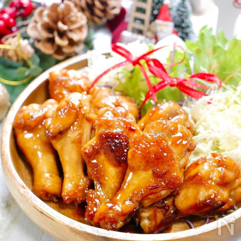 手羽元を使ったワンパン調理でつやつやのローストチキンが作れます。骨付き鶏もも肉よりお手頃で、手に持ちやすく子供でも食べやすいのも嬉しいポイント。野菜を添えて盛ると可愛いクリスマスチキンになりますよ。