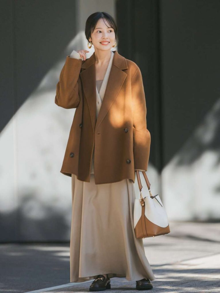 キャメルのテーラードコートに、柔らかなアイボリーのワントーンを重ねた着こなしは、週の折り返しを穏やかに乗り切りたい日にぴったり。ロングスカートの揺れ感が女性らしさを添えつつ、カーディガンの軽さが室内外の気温差にもしっかり対応。取引先との打ち合わせや社内プレゼンなど、きちんと感が求められる場面でも頼れる配色です。レザーバッグが程よく通勤感を引き締めてくれるのも魅力。