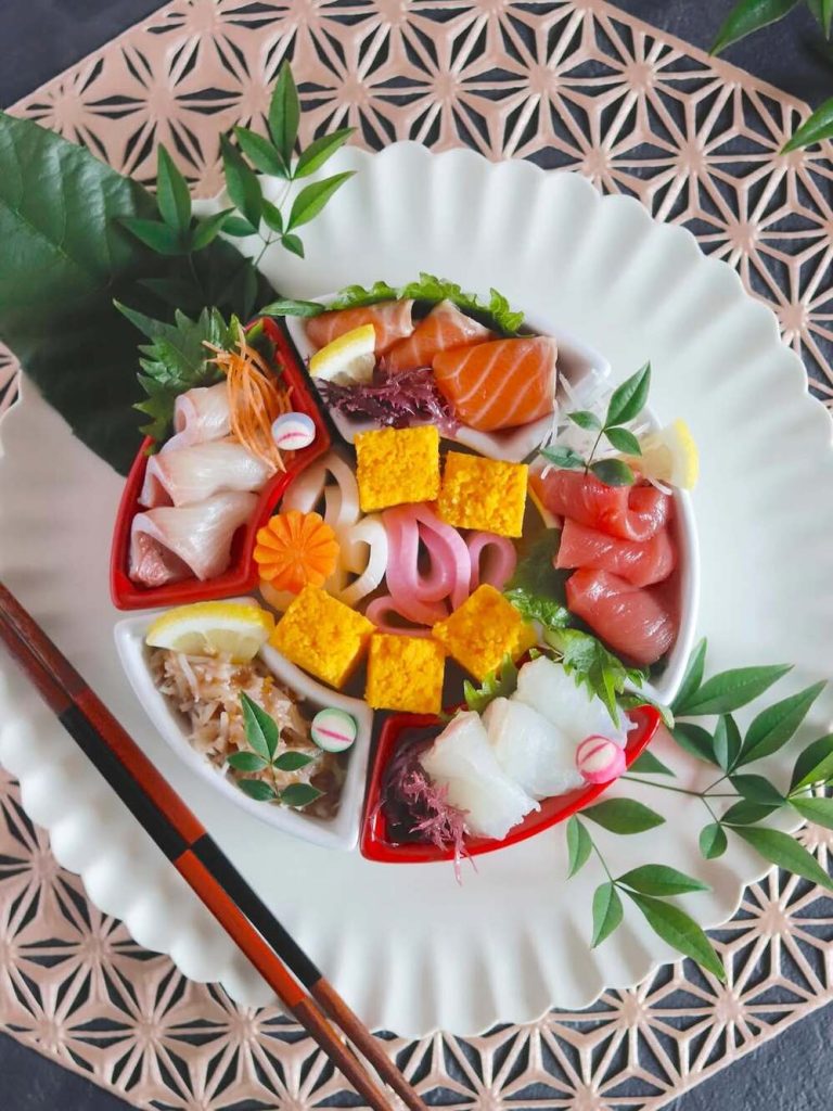 紅白でおめでたい刺身の盛り合わせは、お正月などハレの日の料理にぴったりです。実は個別の扇形の豆皿で、組み合わせることで円になります。普段は小鉢のようにも使うのもあり。テーブルコーディネートのおしゃれ度アップです。