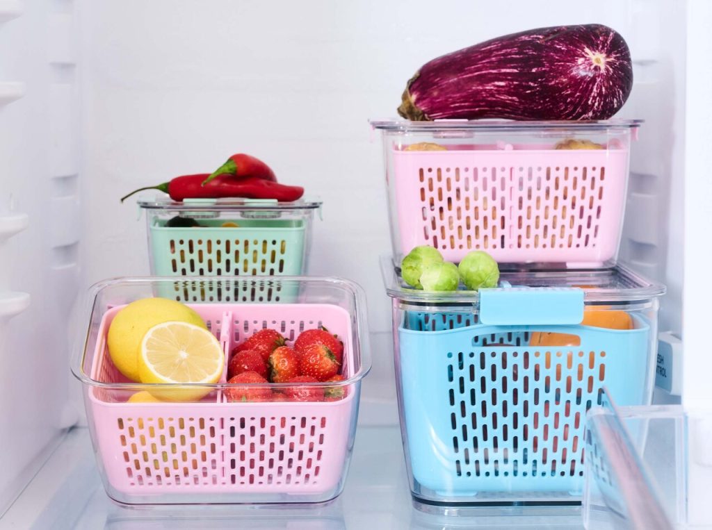 ①洗ってそのまま冷蔵庫へ!「冷蔵庫用コンテナ M(水切り付き)」