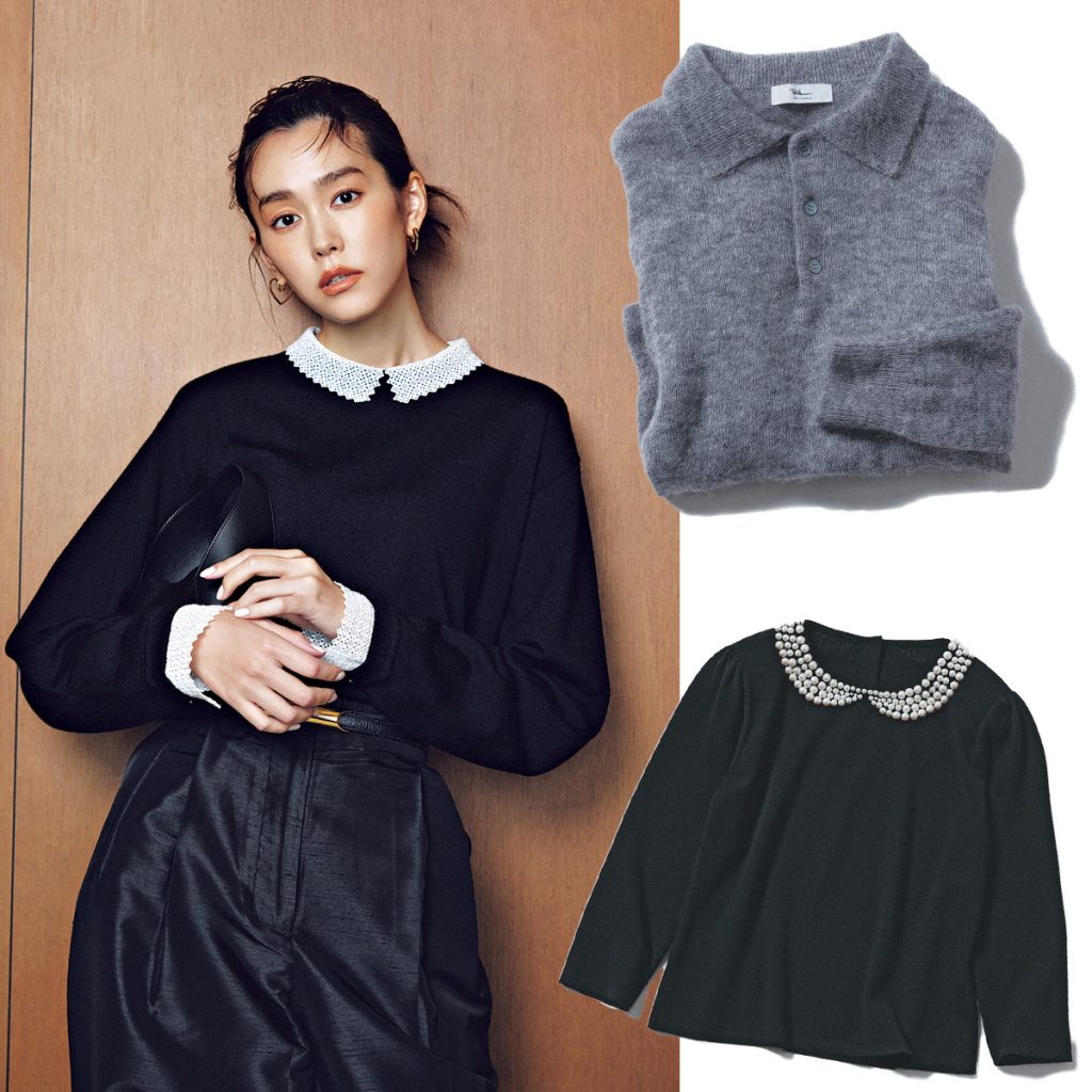 かしこまりすぎず、でもきちんと感が欲しい日に。着ていて楽ちんな衿つきニットが最適解!今回は、ビジュー衿の華やかな1枚から着回し万能なポロニットまで、幅広くラインナップしました。