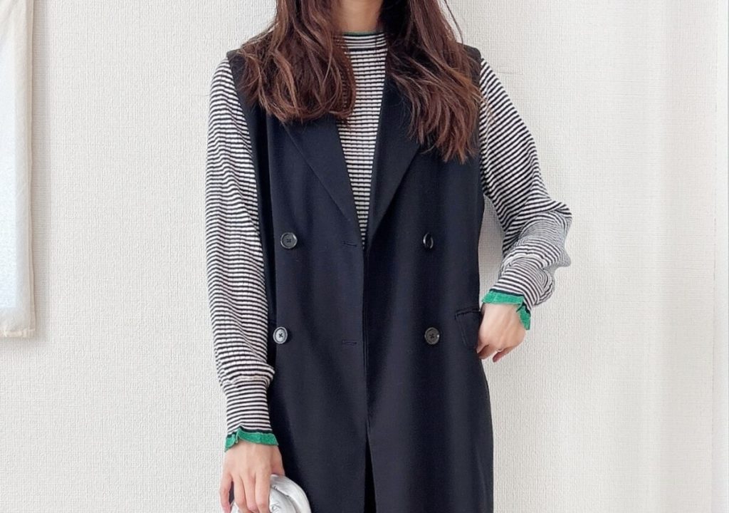 まずはネイビー系ボーダーのニットにブラックのロングジレとワイドパンツを合わせてきれいめコーデにしてみました。程よい厚みのニットなのでジレやジャケットのインナーとしても使いやすいです。