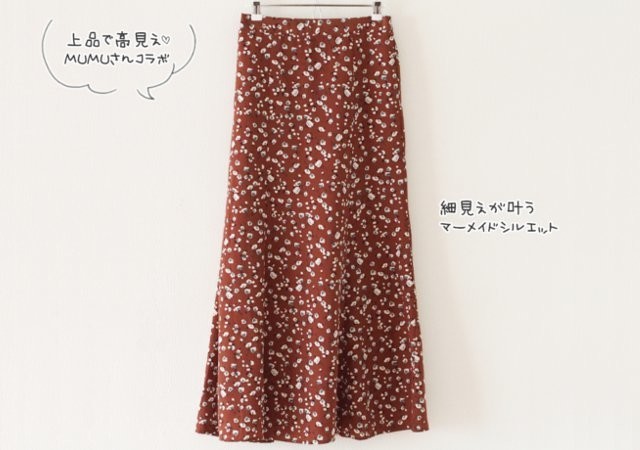 今買って秋まで楽しめる落ち着いた色味のスカート。やりすぎ感のないフレアシルエットだから、着るだけで大人のエレガンスを演出できます。