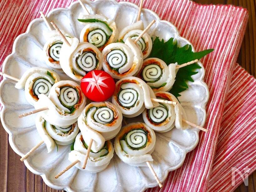 こちらはちくわとチーズ、海苔、大葉をくるくると巻いた渦巻きおつまみ。火を使わず簡単に作れて、ちくわでたんぱく質も摂れます。見た目もインパクトがあって、お弁当箱の中が楽しくなりそうです。